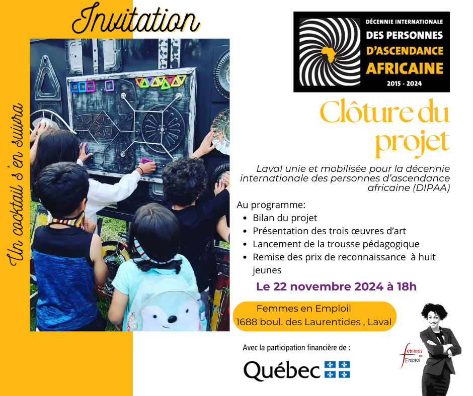 Ce projet, financé par le MIFI, vise à valoriser la contribution des communautés noires à la culture et au développement du Québec. Il comprend deux volets : des conférences-débats sur les luttes et apports des communautés noires, organisées lors du Mois de l’Histoire des Noirs et de la Semaine d’Action Contre le Racisme, ainsi que des caravanes-ateliers interactives destinées aux jeunes de 4 à 17 ans dans les écoles de Laval. Ces ateliers, appuyés par des œuvres d’art visuelles, sensibilisent les élèves à l’importance de l’héritage et des contributions des communautés noires dans la construction de la société québécoise.