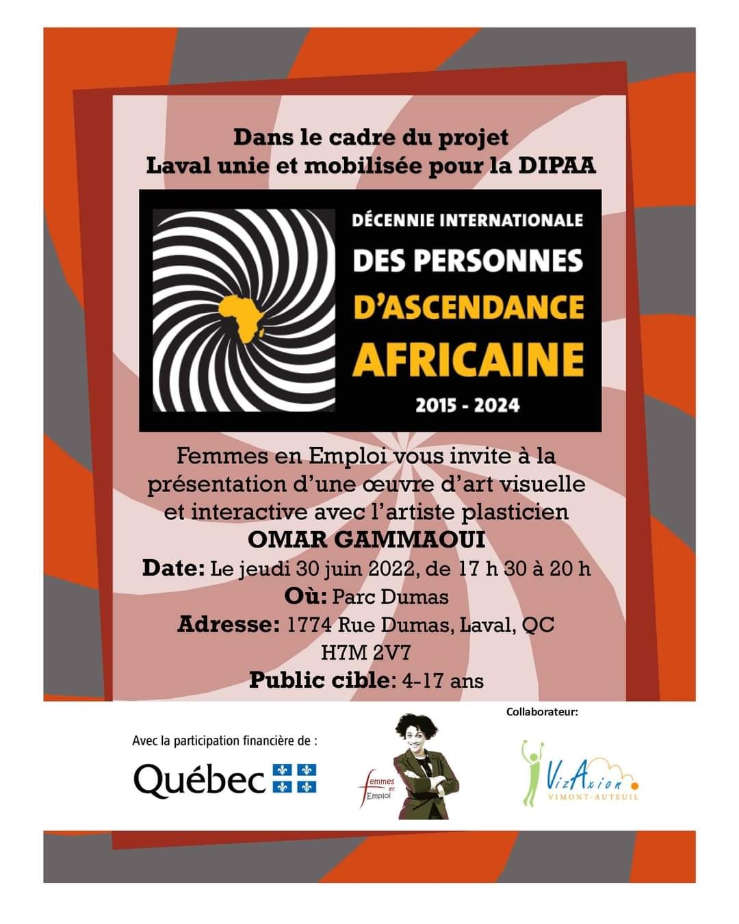 Dans le cadre du projet Laval unie et mobilisée pour  la DIPAA et de la Tournée VizAxion, Femmes en Emploi vous invite à la présentation d’une œuvre d’art visuelle et interactive avec l’artiste plasticien OMAR GAMMAOUI
